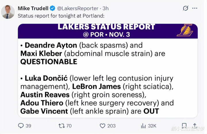 这场比赛除了詹姆斯、蒂耶罗、文森特无法登场外,里夫斯、东契奇也无法在背靠背第二场出战。