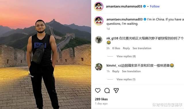 阿曼塔耶夫大概是被中国网友惹怒了,这位脾气暴躁的运动员用AI制作了一张虚假图片,显示他正站在万里长城之上,象征他已经征服中国武术。哈萨克斯坦狂人写道:“我现在就在中国,有什么问题吗?不服来找我啊。”